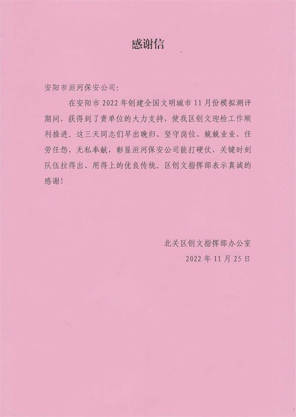 此次,志愿者們?cè)诜?wù)中增強(qiáng)了社會(huì)責(zé)任感,以實(shí)際行動(dòng)圓滿完成了我市文明城市創(chuàng)建任務(wù),同時(shí)北關(guān)區(qū)創(chuàng)文指揮部發(fā)來表?yè)P(yáng)信,表?yè)P(yáng)公司在安陽(yáng)市創(chuàng)文模擬測(cè)評(píng)期間做出的貢獻(xiàn)。彰顯了洹河保安公司能打硬仗,關(guān)鍵時(shí)刻隊(duì)伍拉得出、用得上的優(yōu)良傳統(tǒng),展示了洹河保安公司作為新創(chuàng)省級(jí)文明單位的責(zé)任擔(dān)當(dāng)和奉獻(xiàn)精神。