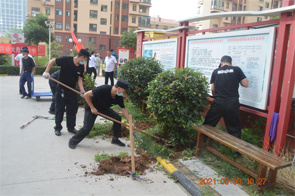 當(dāng)日,8時(shí)30分,會(huì)戰(zhàn)現(xiàn)場(chǎng),黨旗飄揚(yáng),紅旗獵獵。根據(jù)小區(qū)實(shí)際情況,戰(zhàn)前作了劃分區(qū)域,任務(wù)分解,按項(xiàng)目單位分工作戰(zhàn)。指揮員一聲令下,會(huì)戰(zhàn)開(kāi)始。頓時(shí),金鼎園綠地草坪,園內(nèi)空地,人聲鼎沸,機(jī)器轟鳴。有持割草機(jī)清理草地,有拿綠籬機(jī)整理綠化帶,有揮鎬挖樹(shù),有操剪刀修整花卉樹(shù)木,有拔草,有清運(yùn)垃圾,分工明確,忙碌有序,秩序井然。會(huì)戰(zhàn)中大家汗流滿(mǎn)面,衣服被汗水浸透。小區(qū)許多熱心業(yè)主也都紛紛投入到清理環(huán)境的活動(dòng)中。業(yè)主6號(hào)樓樓長(zhǎng)黃小新、黃鳳英,忙前忙后,為物業(yè)員工提供會(huì)戰(zhàn)服務(wù)送來(lái)了礦泉水,業(yè)主安鋼職工謝小飛熱心為員工們購(gòu)買(mǎi)了好幾箱冰棍,滿(mǎn)足提供給參戰(zhàn)員工解渴消暑。真正體現(xiàn)了物業(yè)與業(yè)主一家親,物業(yè)與業(yè)主濃濃的魚(yú)水之情。