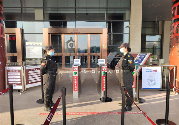根據(jù)工作職責(zé),外圍隊(duì)員負(fù)責(zé)查驗(yàn)游客佩戴口罩、場(chǎng)所碼、48小時(shí)核酸檢測(cè)陰性報(bào)告、電子門票預(yù)約等。女子班隊(duì)員負(fù)責(zé)安檢,提醒游客有序掃碼掃票,并進(jìn)行危險(xiǎn)物品檢查。各展廳隊(duì)員在崗在位,維護(hù)參觀秩序。大家不畏辛苦,堅(jiān)守崗位履職盡責(zé),國(guó)慶期間共接待游客約2萬人次,平均每日3000人次,圓滿完成各項(xiàng)安保任務(wù)。