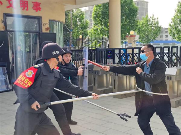 按照應(yīng)急預(yù)案,當(dāng)班的3名保安迅速分工。一人持防暴盾牌正面封堵“歹徒”前進(jìn)路線,兩人持鋼叉從側(cè)后方包抄。面對(duì)“歹徒”的揮砍威脅,保安團(tuán)隊(duì)采用“盾牌交叉防御+鋼叉鎖喉控制”戰(zhàn)術(shù),逐步壓縮其活動(dòng)空間。在與“歹徒”周旋的2分鐘內(nèi),最終協(xié)同將“歹徒”制服。此時(shí)園區(qū)已完成師生避險(xiǎn)疏散,警方支援力量也同步抵達(dá)現(xiàn)場(chǎng)。