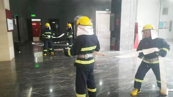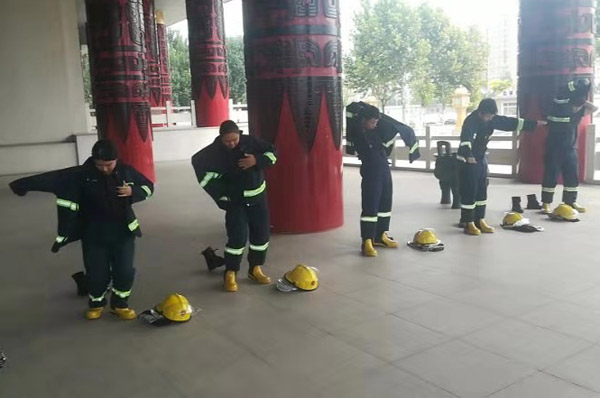 中隊(duì)隊(duì)員在每日消防訓(xùn)練前,在中隊(duì)長(zhǎng)的帶領(lǐng)下認(rèn)真學(xué)習(xí)消防安全知識(shí),滅火器和消火栓等消防器材的使用方法,以及火災(zāi)發(fā)生時(shí)的應(yīng)急措施。中隊(duì)理論與實(shí)踐相結(jié)合,提高隊(duì)員的實(shí)際處置火險(xiǎn)能力,組織隊(duì)員開(kāi)展初起火災(zāi)的撲救、自我安全保護(hù)、組織人員疏散、消防設(shè)施和器材的操作等訓(xùn)練。訓(xùn)練中,特保隊(duì)員發(fā)現(xiàn)火情后,立即啟動(dòng)火災(zāi)應(yīng)急處置方案,有的隊(duì)員迅速穿上消防服裝,觀察樓層火情,隔離起火設(shè)備,有的連接消防栓,打開(kāi)滅火器撲滅火險(xiǎn)。