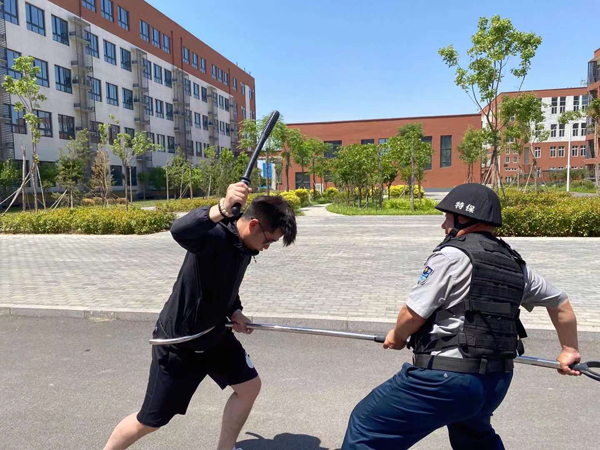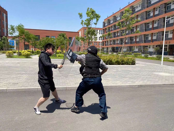 此次演練背景設(shè)置為:在安定祥和的氣氛中,保安正在門崗執(zhí)勤。9時(shí)30分許,一男子來到校門口,要求進(jìn)入學(xué)校。保安在問其緣由后,依照規(guī)定拒絕其入內(nèi)。就在這時(shí),該男子突然強(qiáng)行闖崗。保安見狀,疾步擋在男子前面,男子用棍棒向保安襲來,保安手持盾牌抵擋。男子見無法傷到保安,轉(zhuǎn)身沖向院內(nèi)的教學(xué)樓。保安沖到男子面前,用鋼叉將其牢牢控制住,在同事的幫助下迅速合力將“歹徒”制伏。