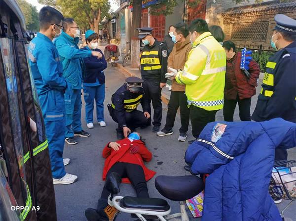 早上7點(diǎn)50分許,巡防隊(duì)員王軍清、梁子力,完成學(xué)校護(hù)校崗安保任務(wù)后,在返回單位途中,發(fā)現(xiàn)文峰北路與三道街交叉口車輛行駛極其緩慢,造成道路擁堵。王軍清立即下車查看,原來(lái)是一輛轎車與一輛電動(dòng)車發(fā)生碰撞,導(dǎo)致電動(dòng)車側(cè)翻倒地,一名約70歲的老人摔倒在地,見此情形,執(zhí)勤隊(duì)員連忙上前詢問查看,發(fā)現(xiàn)該老人表情痛苦,外觀有輕微傷。