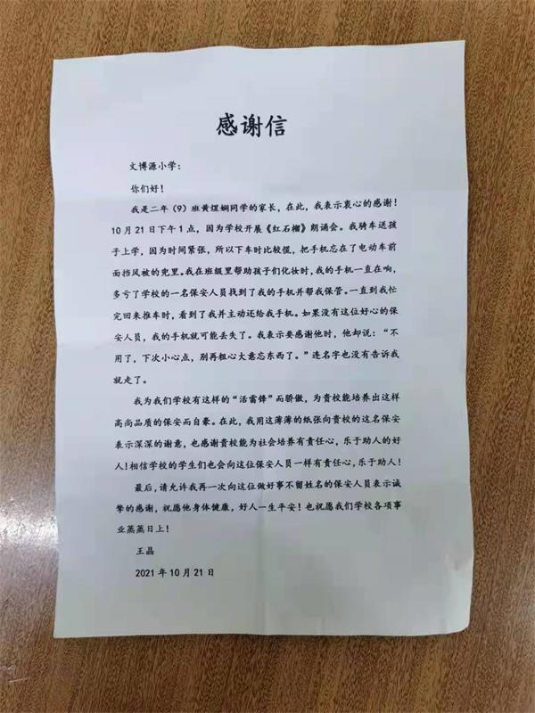 10 月21 日下午1點(diǎn),該校二年級(jí)(9)班黃煜嫻的家長(zhǎng)王晶帶孩子來(lái)校參加《紅石榴》朗誦會(huì)?;琶χ?,下車時(shí)不慎把手機(jī)忘在了電動(dòng)車前面擋風(fēng)被的兜里,便匆匆進(jìn)了學(xué)校。因忙于幫助孩子們化妝,王晶根本想不起手機(jī)的事。后來(lái)她的手機(jī)一直在響,正在門口執(zhí)勤的保安員趙海利循聲找到手機(jī),便幫她保管了起來(lái)。待王晶忙完回來(lái)推車時(shí),趙海利主動(dòng)把手機(jī)交給了她。因?yàn)榇箝T外人行道過(guò)往的人很多,要不是這名保安給她把手機(jī)保管起來(lái),肯定是找不回來(lái)了。王晶驚喜之余,表示要感謝他時(shí),趙海利善意提醒道:“不用了,下次小心點(diǎn),別再粗心大意忘東西了?!闭f(shuō)完便忙他的去了。