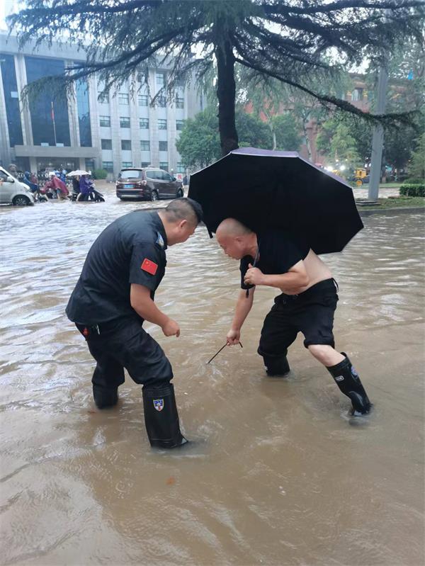 7月5日下午,安陽區(qū)域突遭暴雨襲擊 ,城市道路內(nèi)澇嚴(yán)重,人防一大隊駐中國銀行保安班全力以赴確??蛻魡挝婚T前道路暢通。
