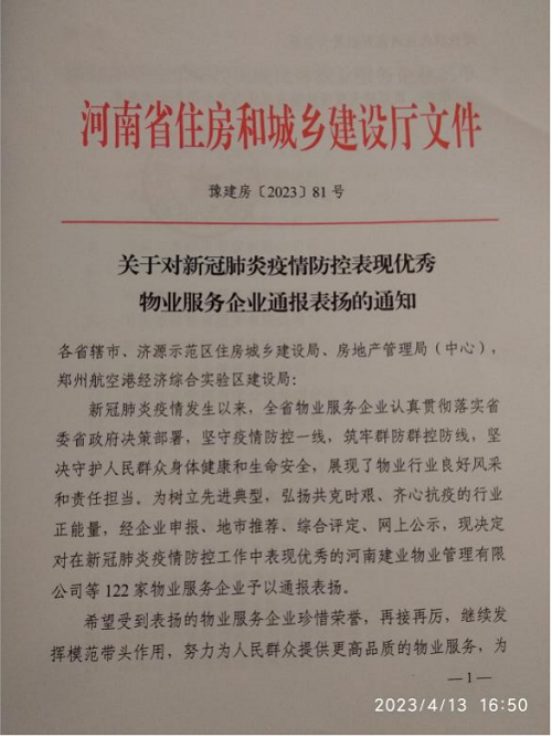 4月8日,河南省住房和城鄉(xiāng)建設(shè)廳通報(bào)表?yè)P(yáng)了全省新冠肺炎疫情防控工作表現(xiàn)優(yōu)秀的122家物業(yè)服務(wù)企業(yè),安陽(yáng)鼎誠(chéng)物業(yè)服務(wù)有限公司榜上有名。