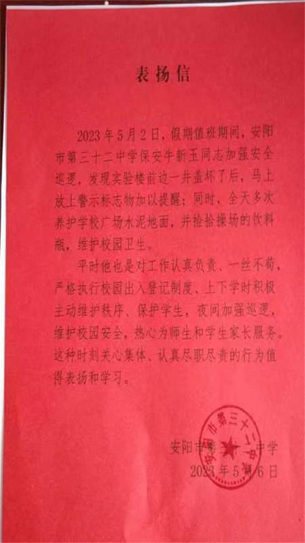 信中說(shuō)道:5月2日,假期值班期間,牛新玉同志加強(qiáng)安全巡邏,發(fā)現(xiàn)學(xué)校實(shí)驗(yàn)樓前邊一井蓋壞了后,馬上放上警示標(biāo)志加以提醒;同時(shí),全天多次養(yǎng)護(hù)學(xué)校廣場(chǎng)水泥地面,并撿拾操場(chǎng)的飲料瓶,維護(hù)校園衛(wèi)生。平時(shí)牛新玉同志對(duì)工作認(rèn)真負(fù)責(zé)一絲不茍,嚴(yán)格執(zhí)行校園出入登記制度、上下學(xué)時(shí)積極主動(dòng)維護(hù)秩序、保護(hù)學(xué)生,夜間加強(qiáng)巡邏,維護(hù)校園安全,熱心為師生和學(xué)生家長(zhǎng)服務(wù)。這種時(shí)刻關(guān)心集體、認(rèn)真履職盡責(zé)的行為值得表?yè)P(yáng)和學(xué)習(xí)。