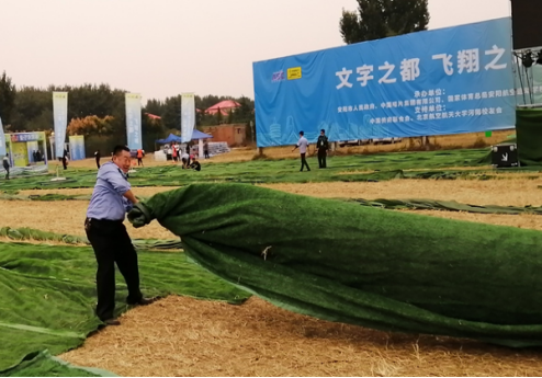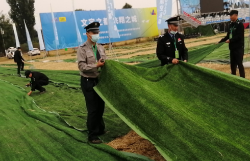 “把這邊拉整齊。”“我這里已經(jīng)鋪平了?!?月30日下午,第十二屆安陽航空運動文化旅游節(jié)主會場,在執(zhí)勤的公司保安員應客戶要求忙著整理會場上草坪地毯。