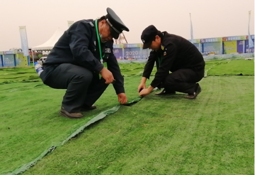昨日,航空節(jié)首日活動結束后,會場上的草坪地毯被晚上的大風刮得亂七八糟,觀眾走上去很容易被絆倒。為確保今天晚上的電音節(jié)活動正常進行,客戶希望抽調部分在場執(zhí)勤人員幫助修整一下。公司現(xiàn)場負責任人收到客戶請求幫助的信息后,在保障安全的情況下,合理調配執(zhí)勤人員,抽調出23名執(zhí)勤人員,幫助客戶整理會場上的草坪地毯。