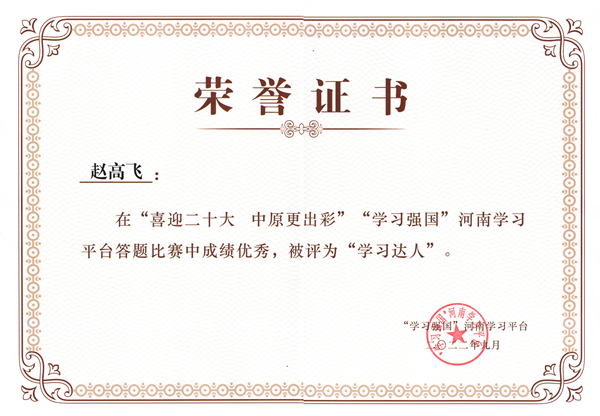 對(duì)于平時(shí)怎樣學(xué)習(xí),趙高飛有自己的學(xué)習(xí)心得,他認(rèn)為,學(xué)習(xí)要貴在勤奮、貴在鉆研、貴在有恒,每天早上第一件事,就是打開學(xué)習(xí)強(qiáng)國(guó)平臺(tái),翻閱感興趣的時(shí)事新聞和行業(yè)動(dòng)態(tài),完成每天的學(xué)習(xí)任務(wù),從不占用工作時(shí)間學(xué)習(xí),都是在上班之前就完成了。對(duì)于參加比賽如何獲得好的成績(jī),趙高飛有一套自己的學(xué)習(xí)竅門。一是要堅(jiān)持,每天堅(jiān)持把當(dāng)日學(xué)習(xí)積分做完,總結(jié)學(xué)習(xí)方法和學(xué)習(xí)技巧。二是勤練習(xí),四人賽、雙人對(duì)戰(zhàn)是關(guān)鍵,要勤練習(xí)各個(gè)答題模塊,熟能生巧。三是有訣竅,他整理出一整套學(xué)習(xí)題庫(kù)達(dá)5000多題,并利用碎片時(shí)間翻看熟記于心,他把各種類型的題分類總結(jié),錯(cuò)題、易錯(cuò)題收藏起來(lái),反復(fù)練習(xí)、各個(gè)擊破,最終,他克服一切困難,集中一切精力用5個(gè)小時(shí)時(shí)間,通關(guān)“強(qiáng)國(guó)總題庫(kù)”共4202題。四是重交流,他加入了“學(xué)習(xí)強(qiáng)國(guó)”全國(guó)學(xué)習(xí)聯(lián)盟、“學(xué)習(xí)強(qiáng)國(guó)”河南學(xué)習(xí)聯(lián)盟等學(xué)習(xí)微信群,和學(xué)習(xí)達(dá)人們一起探討答題經(jīng)驗(yàn)和技巧