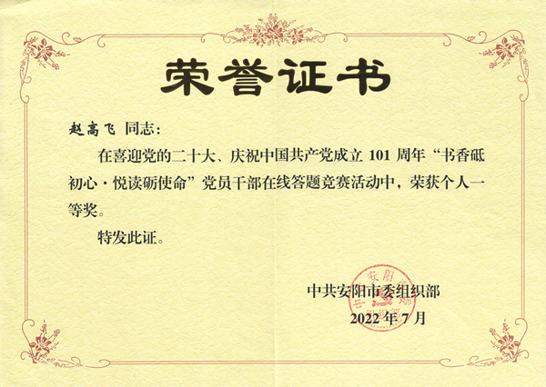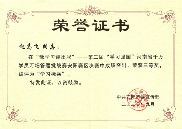趙高飛,35歲,中共黨員,本科學(xué)歷,現(xiàn)任鼎信子公司副經(jīng)理,自“學(xué)習(xí)強(qiáng)國(guó)”平臺(tái)上線以來(lái),趙高飛學(xué)習(xí)成績(jī)屢創(chuàng)新高,先后榮獲2020年度學(xué)習(xí)強(qiáng)國(guó)挑戰(zhàn)賽安陽(yáng)市賽區(qū)決賽“個(gè)人三等獎(jiǎng)”,2021年度安陽(yáng)市黨員干部在線答題競(jìng)賽“個(gè)人三等獎(jiǎng)”,2022年度學(xué)習(xí)強(qiáng)國(guó)河南學(xué)習(xí)平臺(tái)“喜迎二十大、中原更出彩”答題比賽“周達(dá)人”及“學(xué)習(xí)達(dá)人”,2023年度“強(qiáng)國(guó)有我 學(xué)習(xí)興安”學(xué)習(xí)強(qiáng)國(guó)答題挑戰(zhàn)賽安陽(yáng)市決賽“個(gè)人二等獎(jiǎng)”,2023年度學(xué)習(xí)強(qiáng)國(guó)河南學(xué)習(xí)平臺(tái)“貫徹二十大精神、建設(shè)現(xiàn)代化河南”強(qiáng)國(guó)答題比賽“周達(dá)人”。學(xué)習(xí)從來(lái)都不是一蹴而就的,這些成績(jī)的獲得,是趙高飛日積月累堅(jiān)持學(xué)習(xí)的成果。
