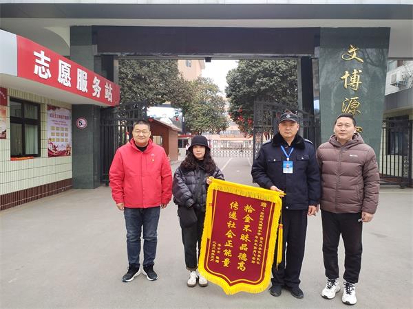 3月6日上午,安陽(yáng)李女士拿著“拾金不昧品德高 傳遞社會(huì)正能量”的錦旗,來(lái)到安陽(yáng)市人民大道小學(xué)教育集團(tuán)文博源小學(xué),對(duì)安陽(yáng)市洹河保安公司人防二大隊(duì)駐該校保安中隊(duì)長(zhǎng)李伏林和年級(jí)主任肖飛老師連聲道謝。
