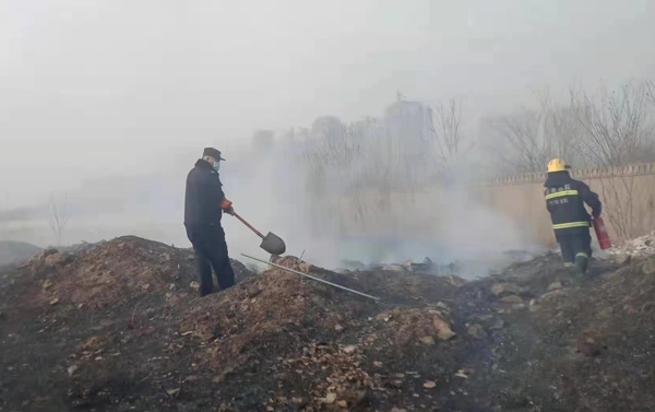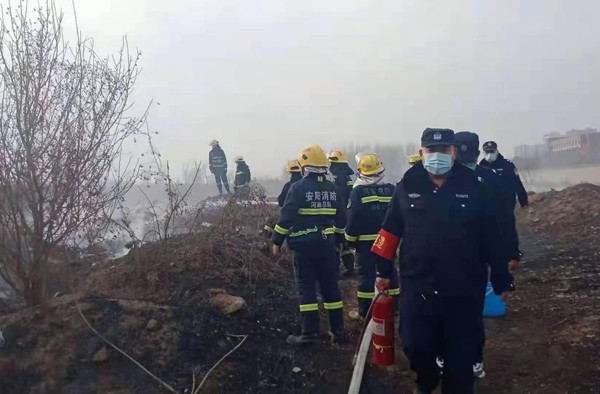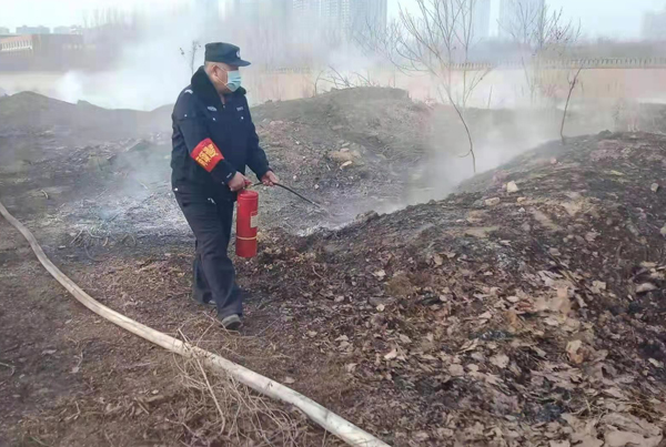 上午9時(shí)許,保安員屈國營、郭慶陽、李海軍、申安民巡邏至轄區(qū)中華路王官屯北路時(shí),看到路邊防護(hù)林草叢正在燃燒,由于天干物燥,火勢蔓延很快。隊(duì)員立即引導(dǎo)旁邊群眾疏散,撥打119消防電話報(bào)警,并從車上拿出滅火器冒著滾滾濃煙,全力撲滅大火,盡最大努力防止大火蔓延,避免造成更大的損失。雖然灰燼落滿了全身、汗水濕透了衣背、濃煙模糊了雙眼,但保安員依然斗志昂揚(yáng)、毫不畏懼。很快,消防救援人員趕到,保安員又配合消防人員,終將燃燒的干草撲滅。