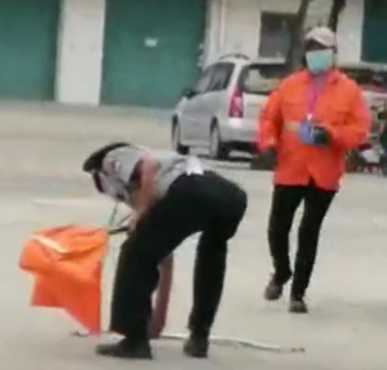 下午2點(diǎn)40許,保潔車經(jīng)過(guò)4號(hào)門(mén),路面不平,工具掉落地上,人防二大隊(duì)王紅軍喊停環(huán)衛(wèi)人員,幫其撿起清潔工具。