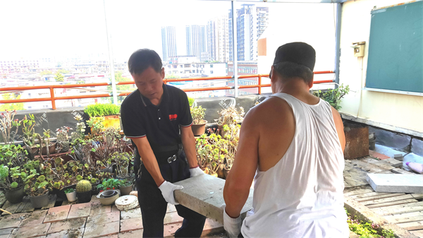 由于該校教學(xué)樓上遺留有一定數(shù)量的花池、石塊、石槽、建筑塊、水泥塊、地板、磚等物,校方排查存在安全隱患,需要把樓頂?shù)臇|西清運下來。按照支部組織謀劃安排,當(dāng)日上午8點半,在黨員、中隊長劉宇,預(yù)備黨員、副中隊長楊承濤帶領(lǐng)下,同志們齊心協(xié)力、相互配合,采取接力方式向下轉(zhuǎn)運。有的一塊石頭有二三百斤,他們就用繩子捆住向下抬,一個個累得汗流浹背,但沒有一個人叫苦叫累,張運洲邊干邊反復(fù)提醒大家注意安全。他們利用一上午時間,把大部分體積較大的石塊、石板、地磚等物安全清理下樓,又把清運堆積在樓道的東西,搬運到200米外的樓后隱蔽處。